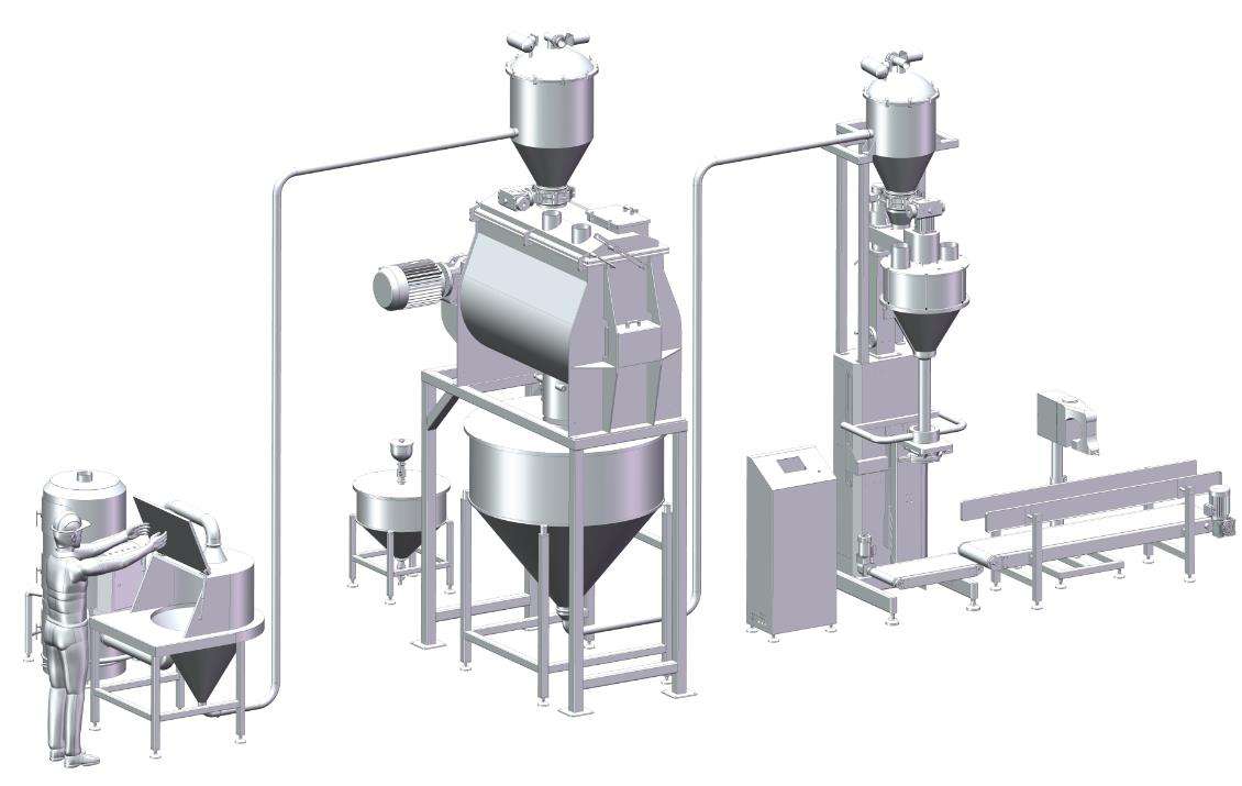 當小袋物料需要拆包倒入下道工序時,只需人工直接拆包放入系統即可。給料過程中產生的物料粉塵由除塵風機收集。物料通過振動篩(安全篩)攔截散狀物料和異物,保證符合要求的顆粒順利輸入。