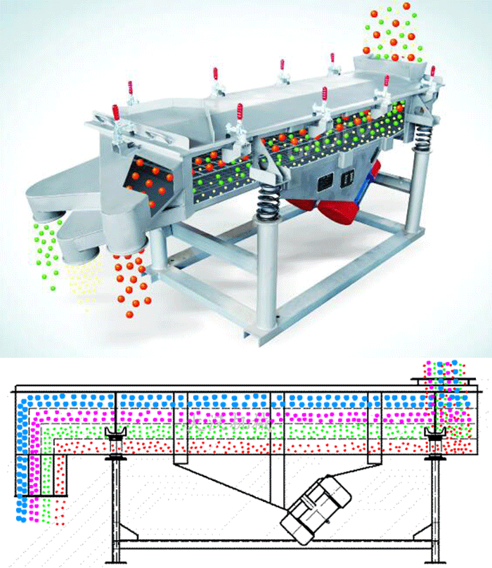 多層直線振動篩利用雙臺電機作為振動源,物料在篩網(wǎng)上受激振力的作用被拋起,同時向前做直線運動,物料從給料機均勻地進入直線篩進料口后,通過多層篩網(wǎng)產(chǎn)生了數(shù)種不同規(guī)格的篩上物、篩下午,后分別又從各自的出口排出。